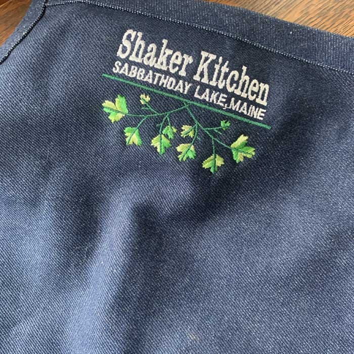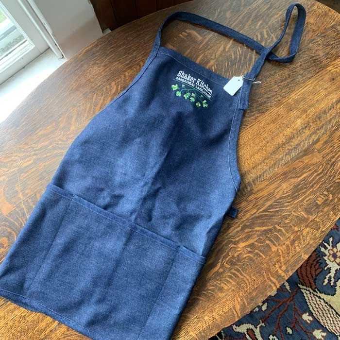 Handsome denim mid-length apron just like the Shakers wear in their own kitchen! Embroidered “Shaker Kitchen Sabbathday Lake Maine” with decorative vines by friend and neighbor Diane Harriman of Hast Company. This comfortable soft denim is fully adjustable with waist tie-strings and adjustable buckle neck, and 3 front pockets at the bottom.