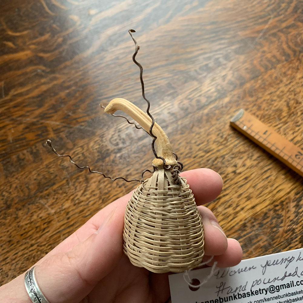 Miniature woven pumpkin handmade by Kathryn Polletto of Kennebunk Basketry in Kennebunk, ME. Made with hand pounded Ash and natural stem.