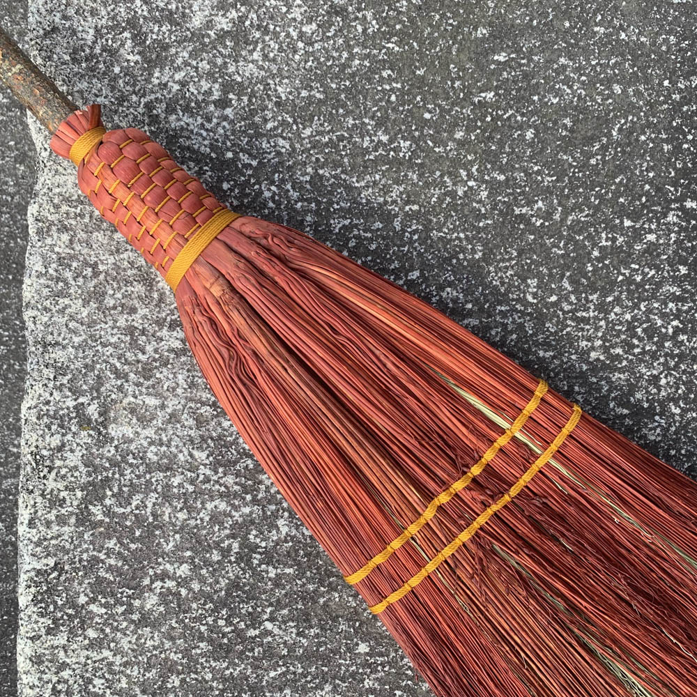 Hand Plaited Whisk Broom in Red broomcorn with Orange twine and Natural Handle by Zodi Brooms.