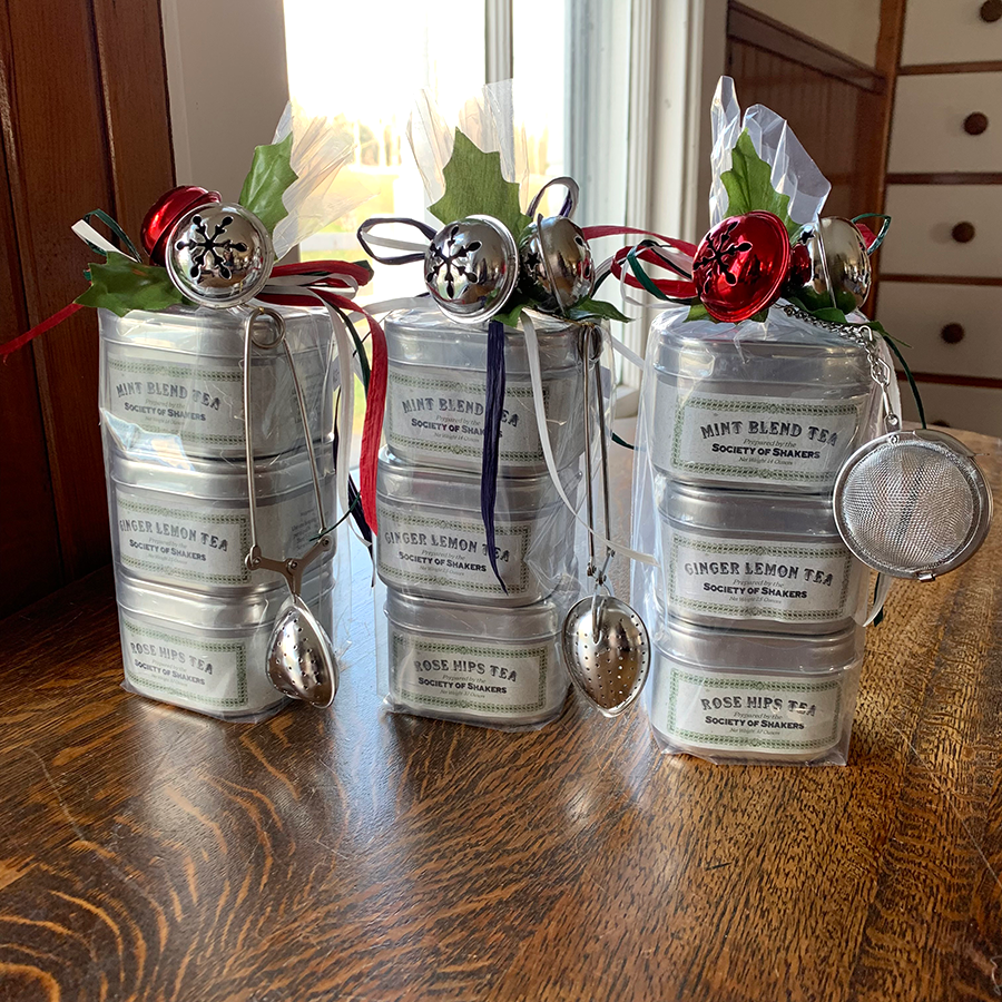 Shaker Herbal Tea Gift Set is presented in a clear wrap with an attached tea strainer and holiday bells, bows, and faux holly attached. Includes one tin each of our Shaker herbal tea: